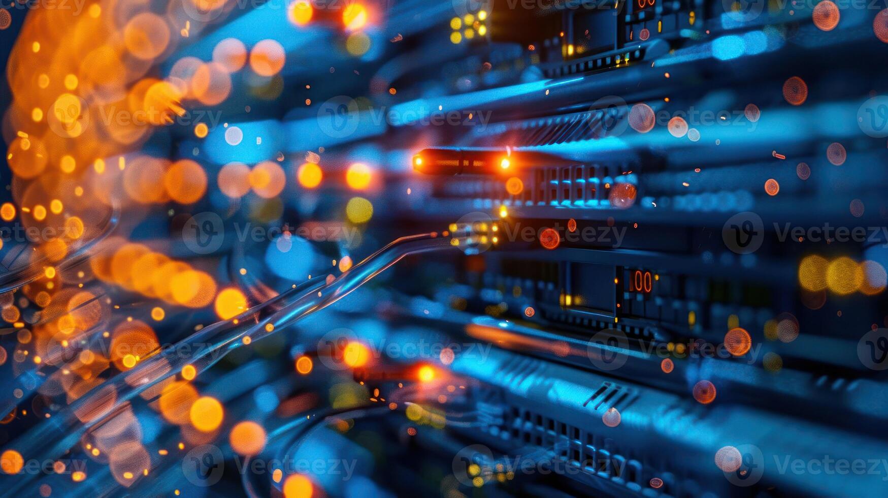 Abstract view of illuminated server cables in a data center with colorful bokeh background Pro Photo
