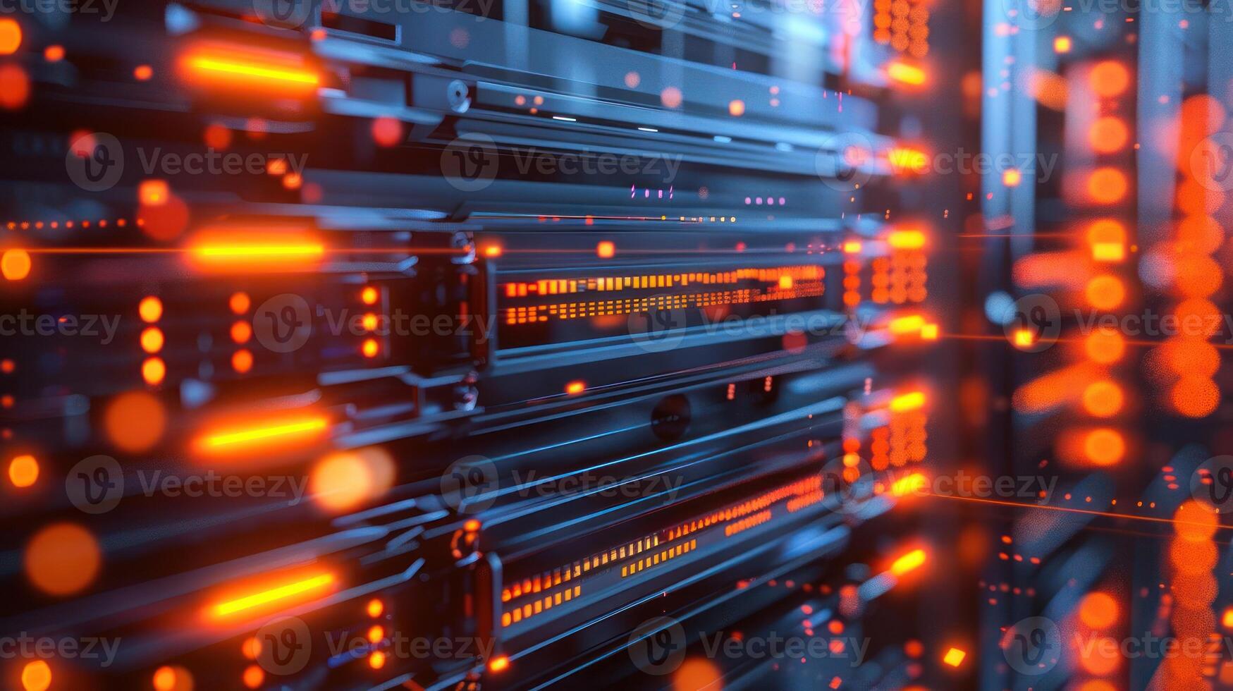 Abstract view of illuminated server racks showcasing data flow and technology in a digital environment Pro Photo