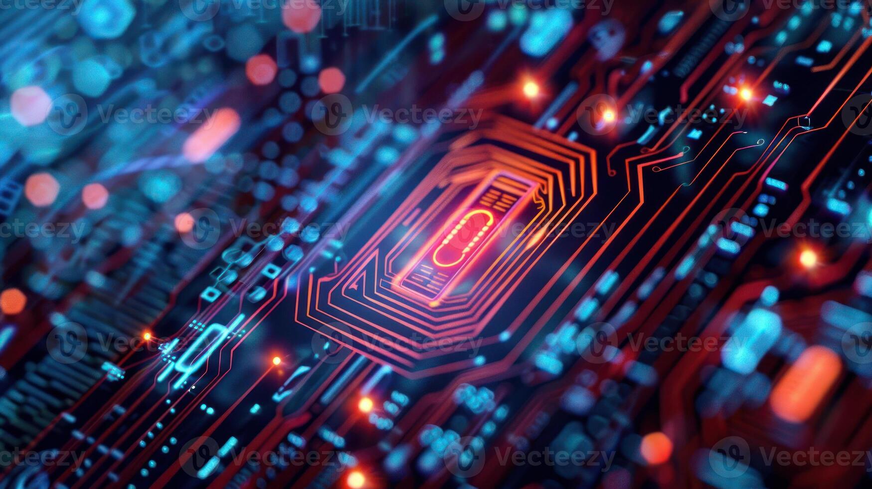 Close-up view of a vibrant microchip circuit board with glowing elements and intricate patterns Pro Photo