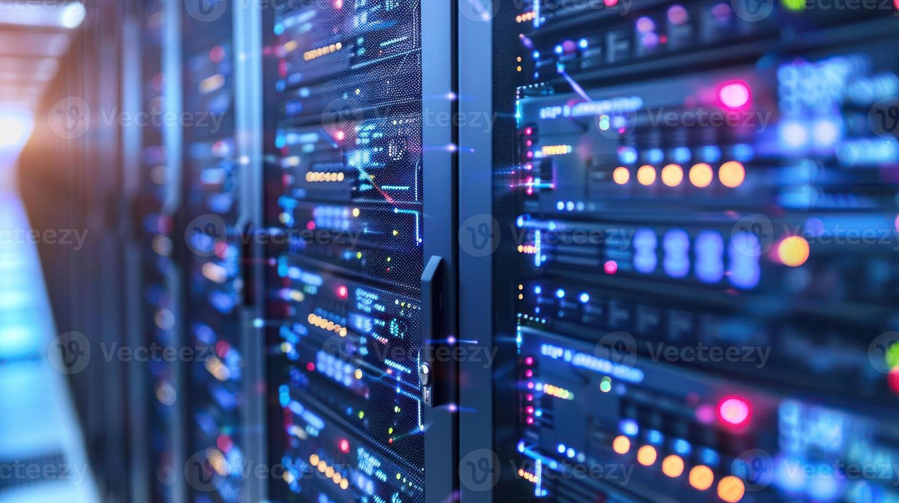 High-tech data center with illuminated server racks and digital connections in a modern environment Pro Photo