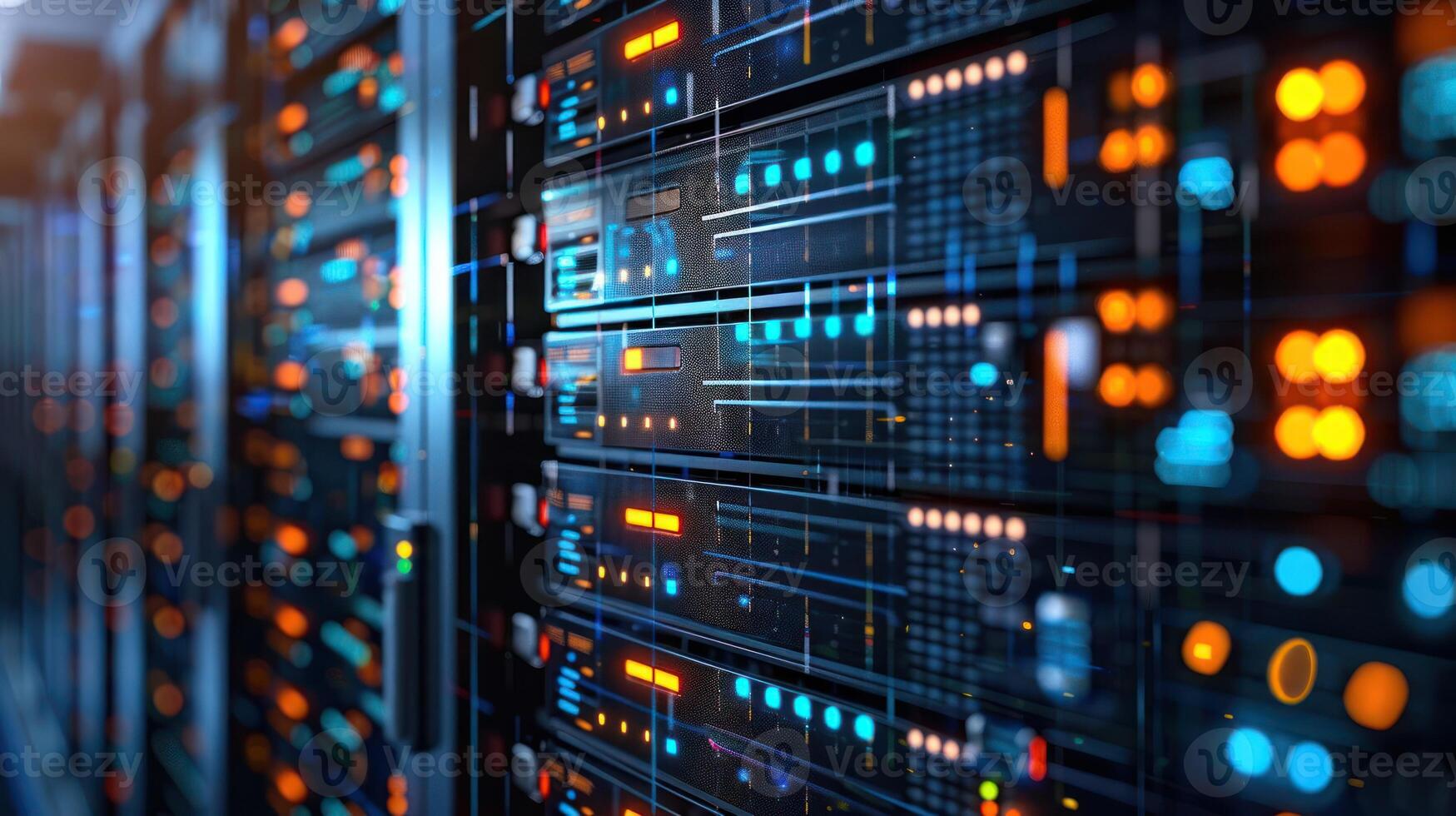 Close-up view of a modern data center with illuminated server racks and digital displays Pro Photo