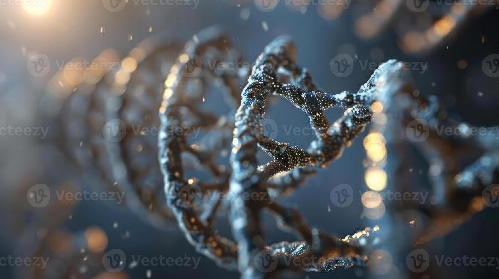 Close-up view of a DNA double helix structure with shimmering particles, representing genetic science Pro Photo