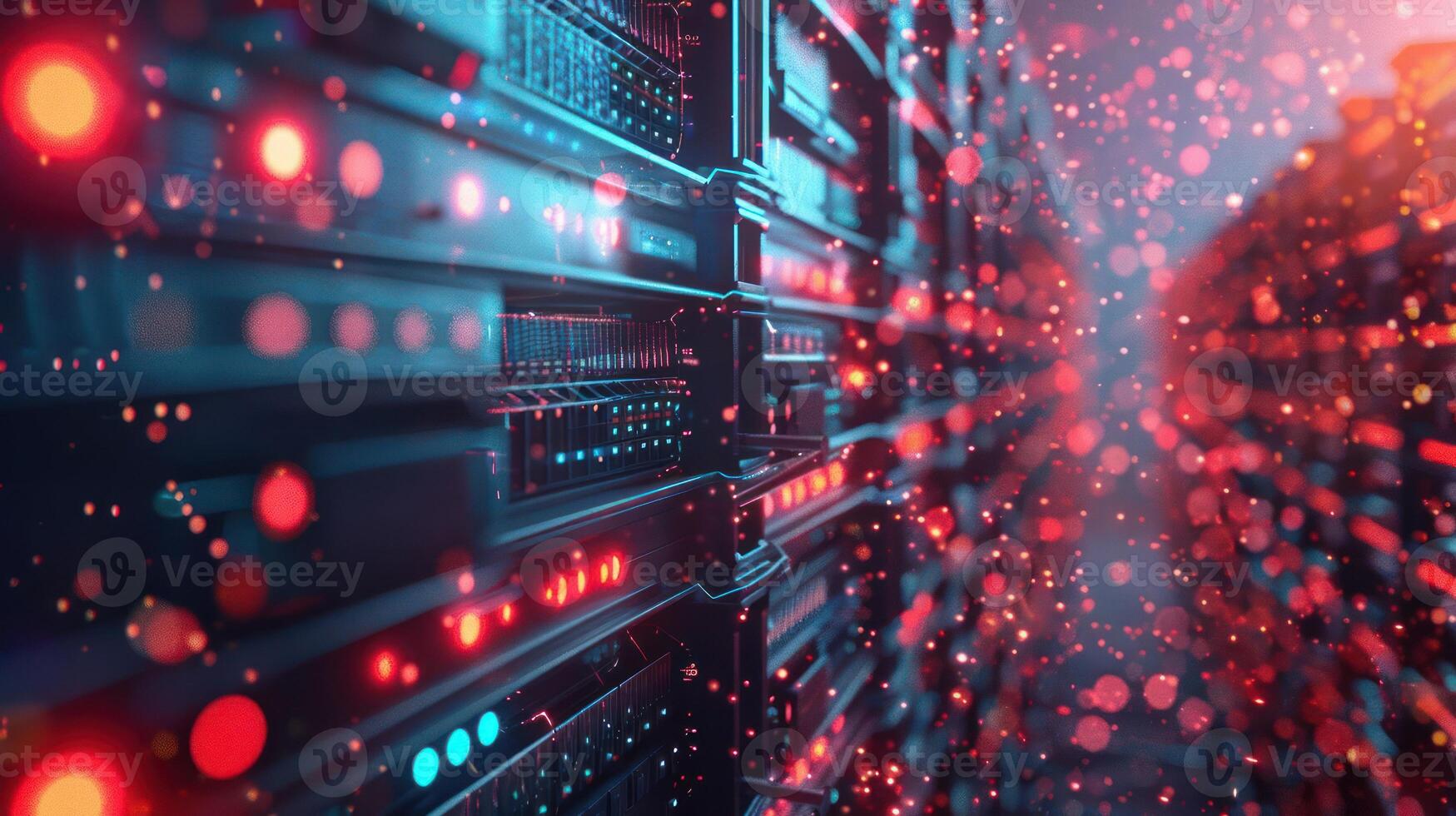 Abstract view of a data center with illuminated servers and vibrant bokeh effects in the background Pro Photo