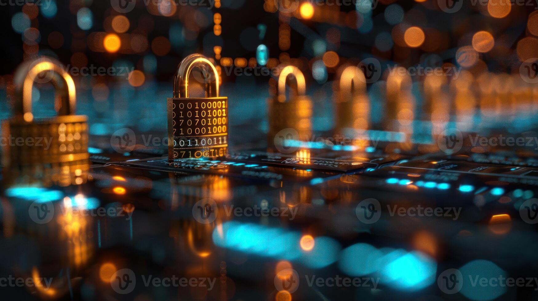 Digital locks on a circuit board symbolize cybersecurity and data protection in a tech environment Pro Photo