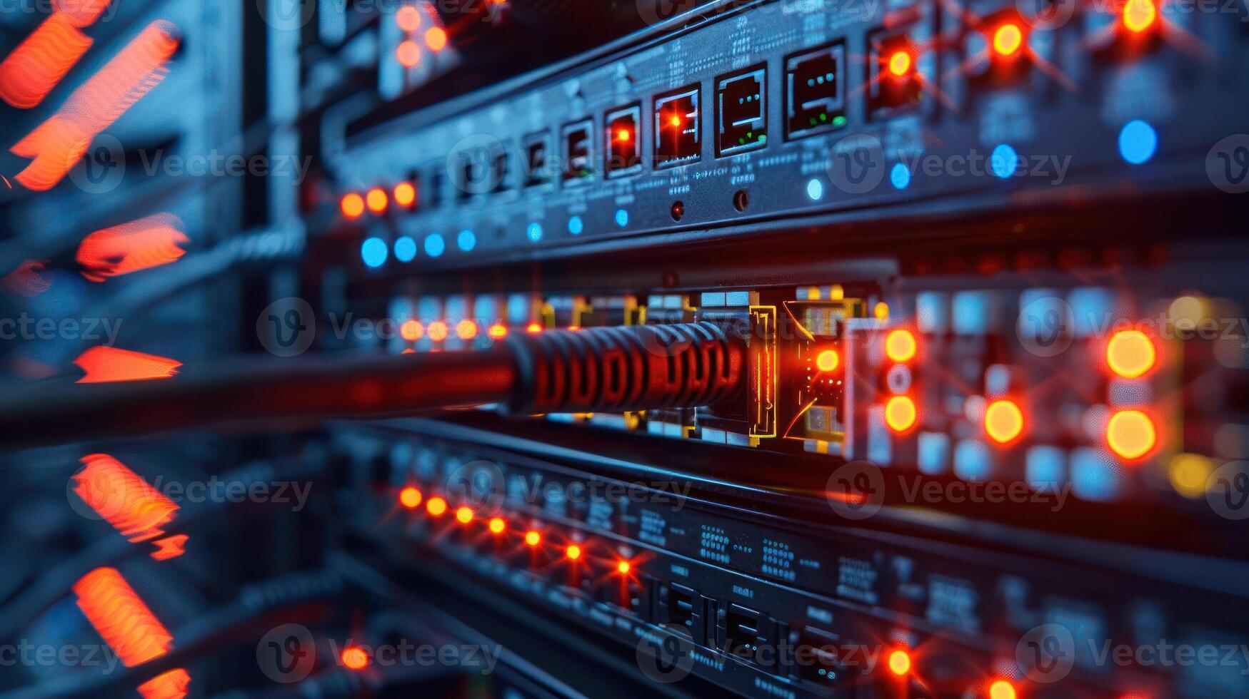 Close-up of illuminated server rack with network cables, showcasing data transfer in a tech environment Pro Photo