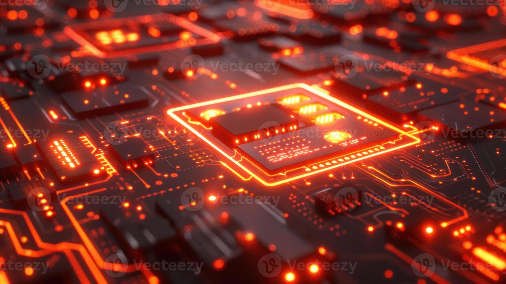 Close-up view of a glowing circuit board with intricate patterns and luminous components Pro Photo