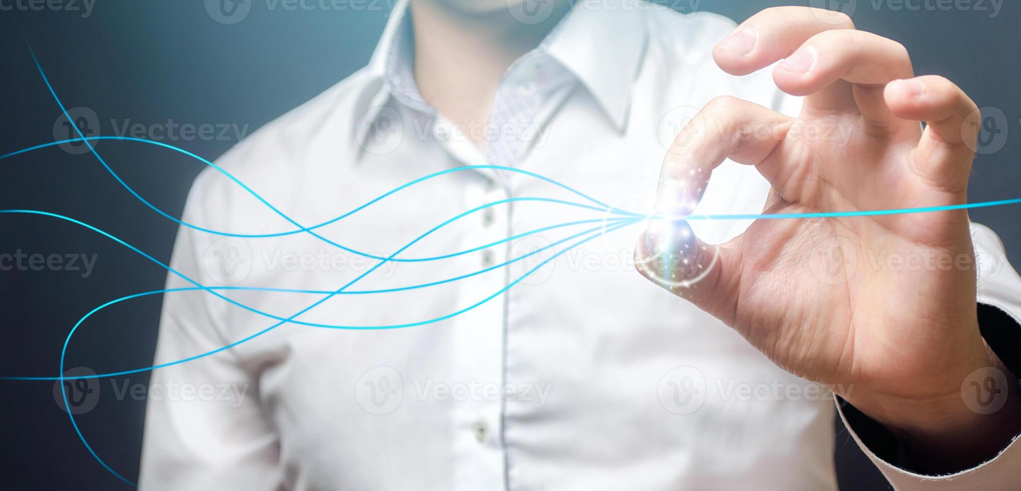 The man straightens the untied thread line. Simplification, problem solving. Settle things up. Optimization, improvement of business processes. Simplification planning. Best option. Remove deviations Pro Photo