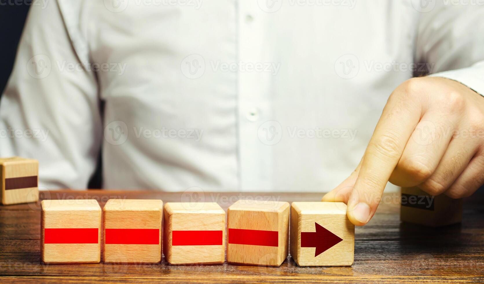 Man builds an arrow from blocks. Business development, growth process concept. Career promotion, improving skills. Business building and expansion. Goal achievement. Progress and movement forward. Pro Photo