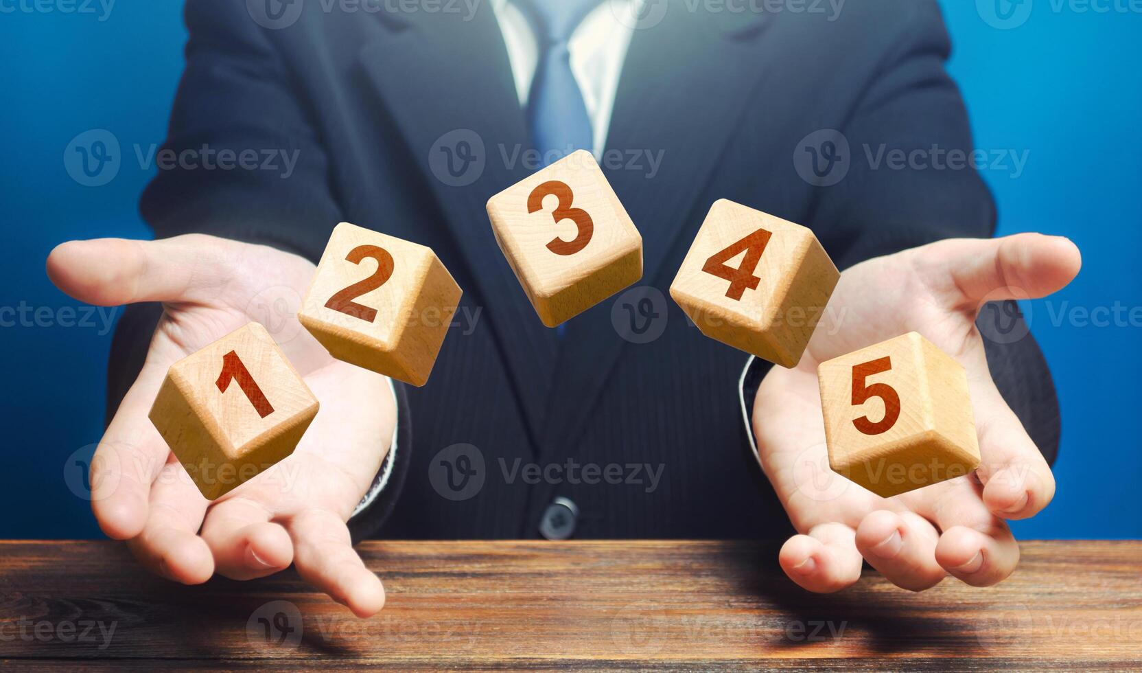 Man throws 5 numbered blocks with the numbers one two three four five from his hands. Five easy steps. Organization and systematization, step by instructions. Business planning, action plan. Pro Photo