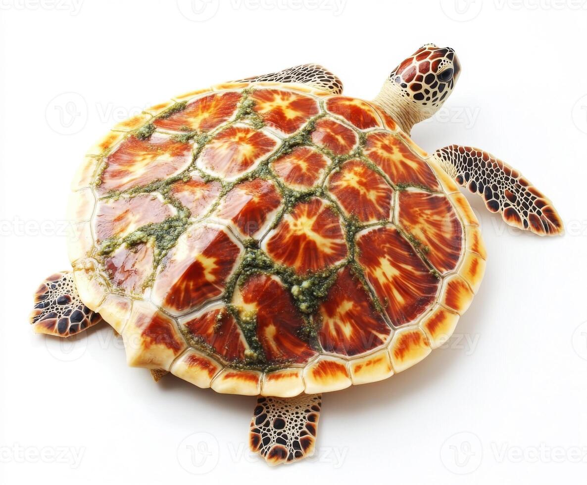 Colorful sea turtle basking in natural light against a white background, showcasing unique shell patterns and features Pro Photo
