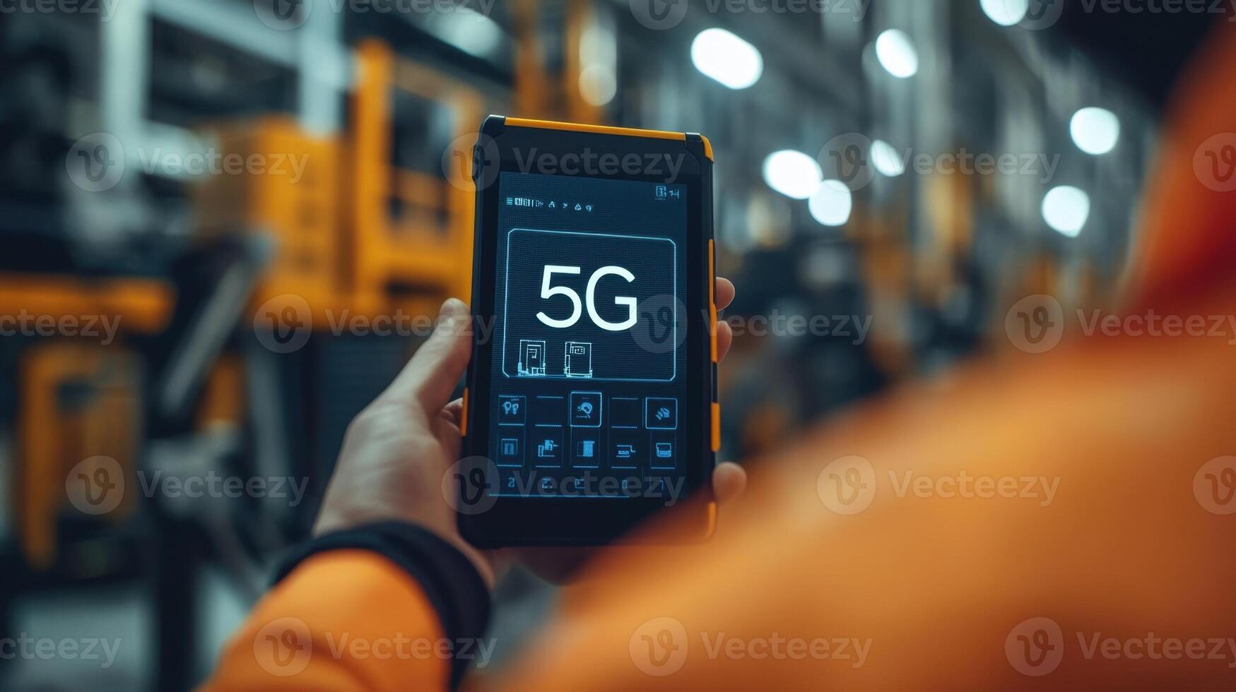 A macro shot of a handheld device used by factory operators featuring a 5G connectivity icon on the display signifying its role in monitoring and controlling machinery remotely Pro Photo