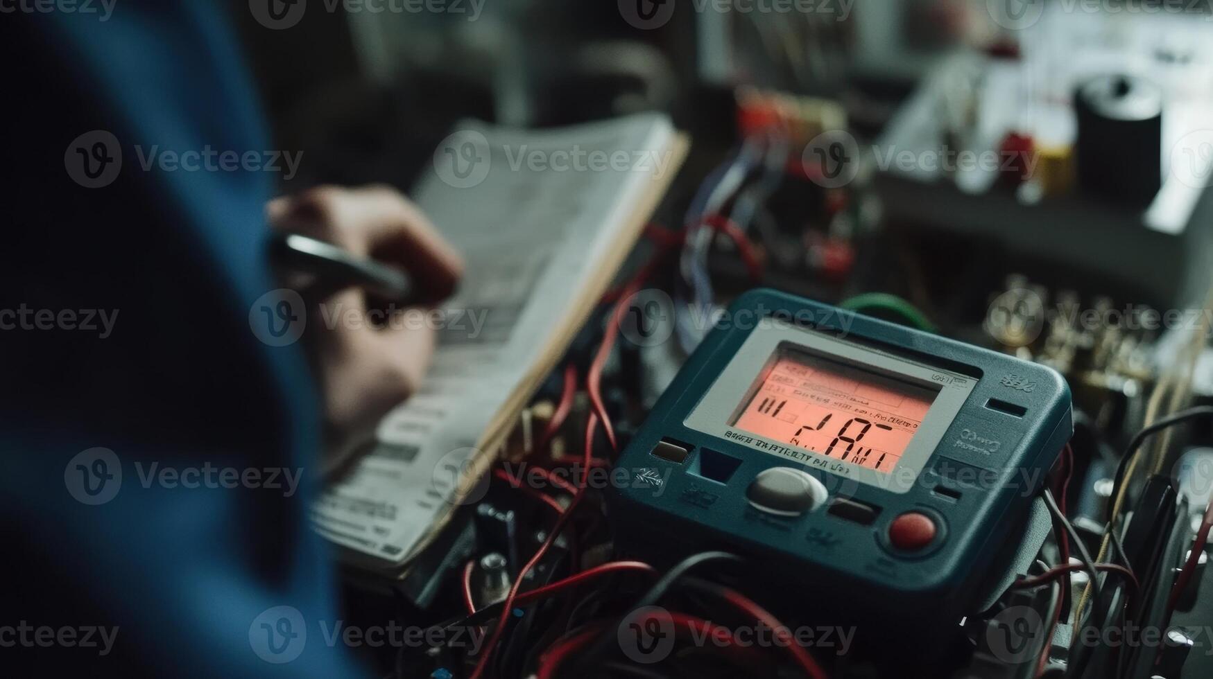 A closeup of a digital multimeter displaying fluctuating readings while connected to a malfunctioning circuit with a technician consulting a troubleshooting guide beside it Pro Photo