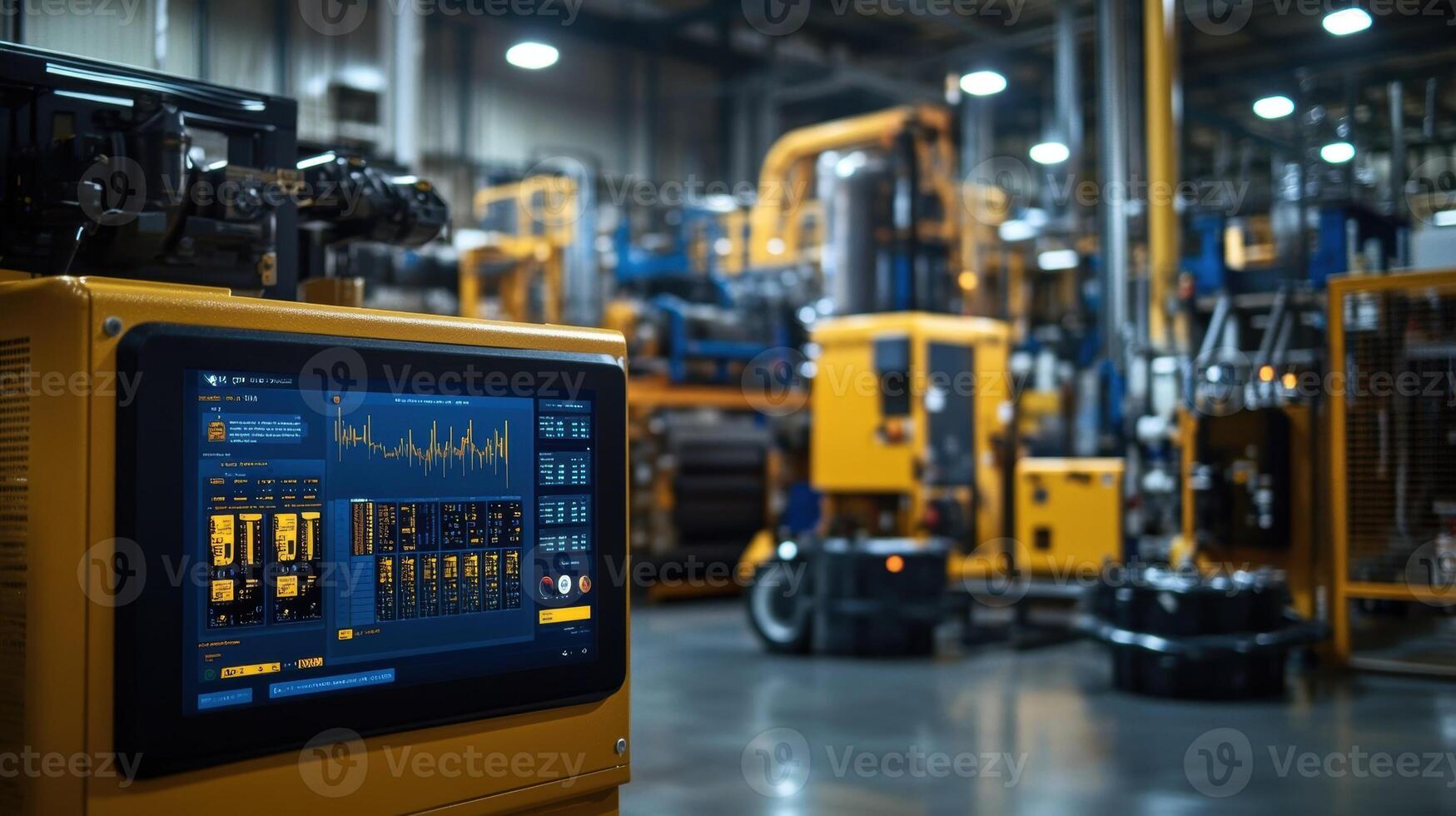 An associative image of a digital display showing predictive maintenance alerts while various machines operate behind it underscoring the benefits of edge computing in ensuring continuou Pro Photo