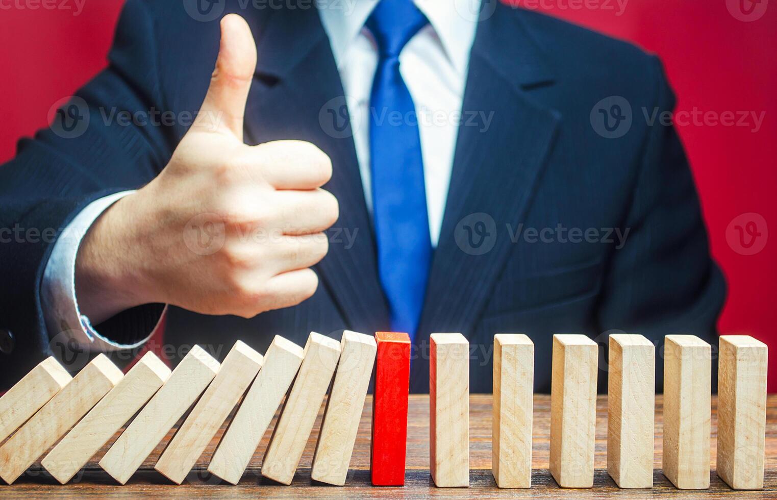 A businessman shows a thumbs up approval over a stopped process falling domino. Find a way stop the problem and prevent its spread. Achieving success and completing a task. Solution. Cyber protection Pro Photo