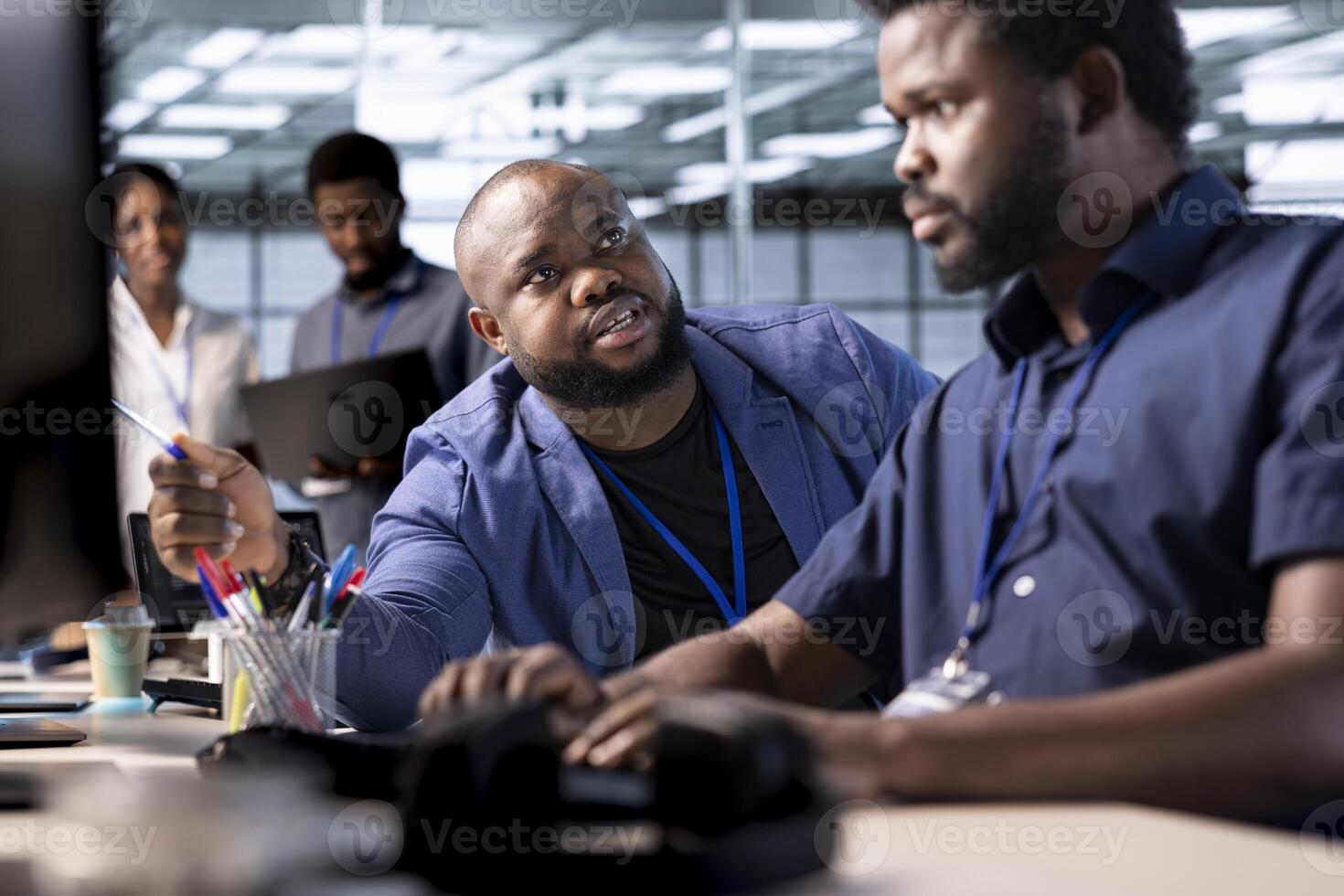 Unhappy manager admonishing technician after failing to properly reconfigure server farm to optimize it for data processing requirements of customers, berating him while pointing to coding mistakes Pro Photo