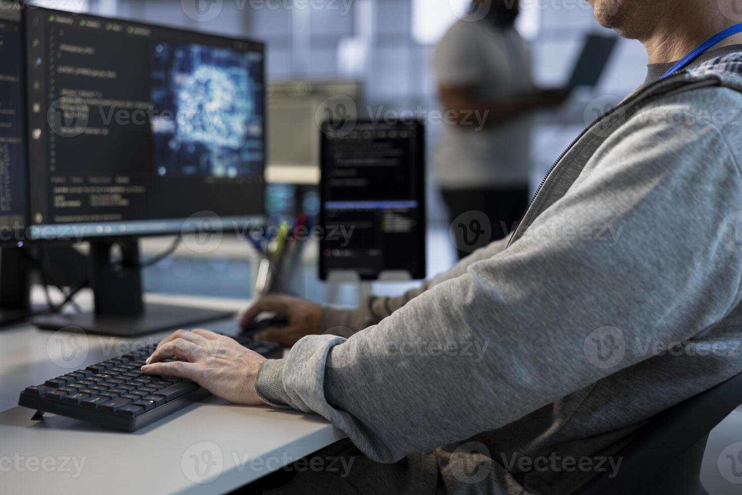Programmer using artificial intelligence technology to optimize data center performance, close up. Man in server hub using AI tech to streamline operations and accurately forecast vulnerabilities Pro Photo