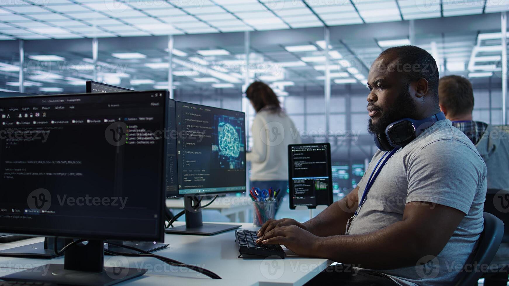 Engineer working in high tech establishment providing computing resources for different workloads. African american man tasked with monitoring data center supercomputers, camera B Pro Photo