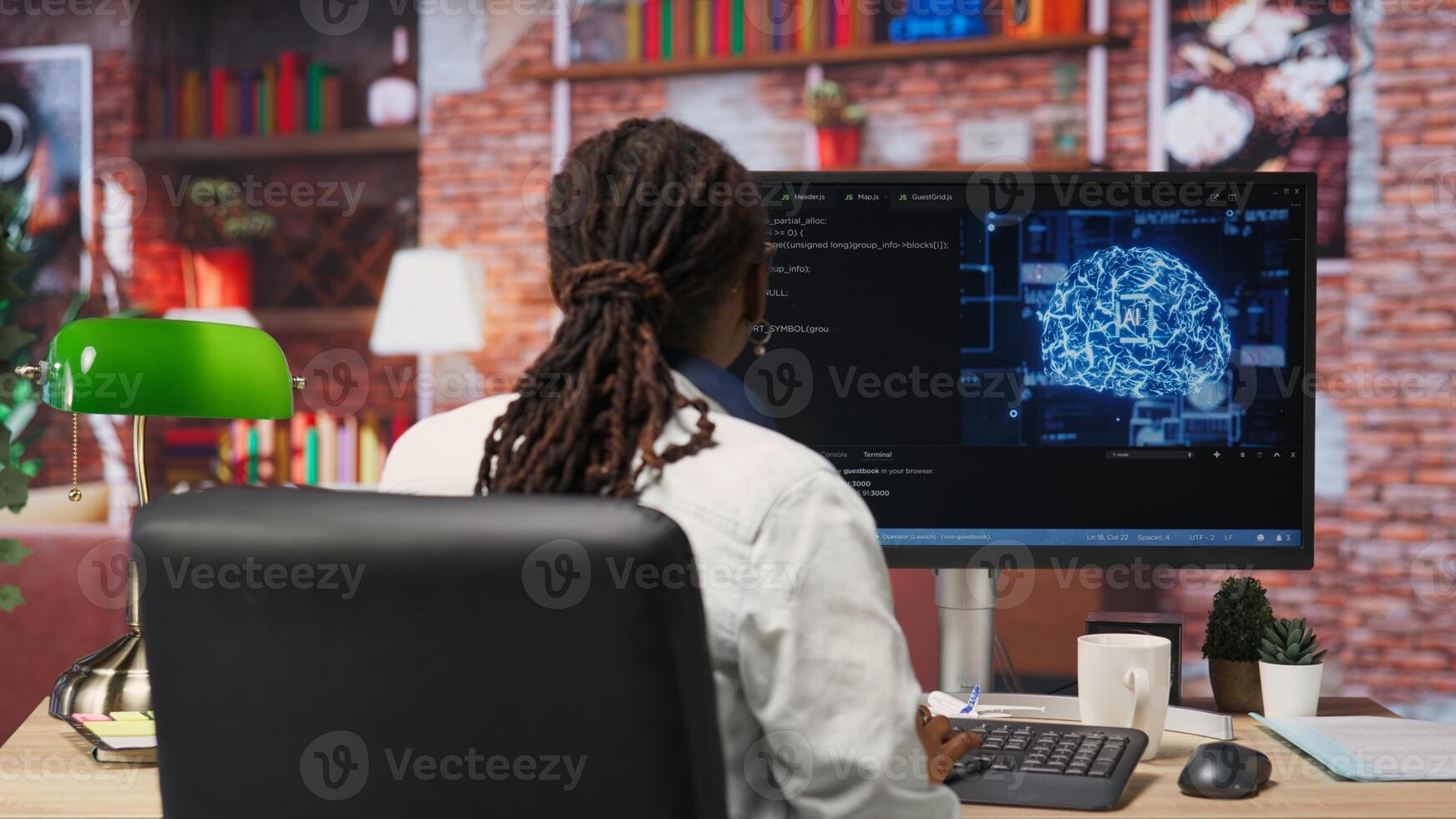 Admin writing code on computer and doing maintenance on artificial intelligence neural networks computerized model. Tech support expert typing on keyboard, doing checkup on AI systems, camera B Pro Photo