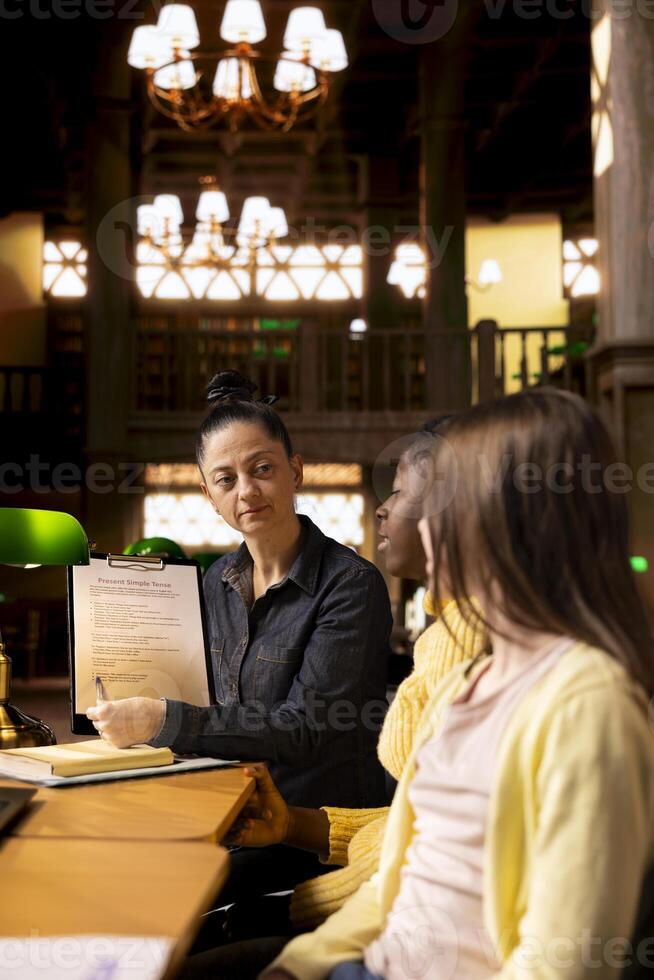 Female professor guiding primary school pupils on a team project, presenting a file to guide them towards assignment success. Effective tutoring techniques during private lessons. Pro Photo