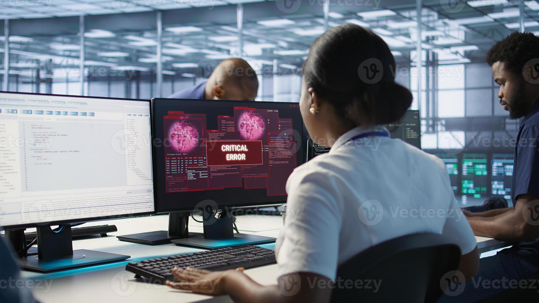Woman seeing critical error on PC screen in data center, requesting help from cybersecurity team. Employee seeing security incidents affecting server room network system, camera A Pro Photo