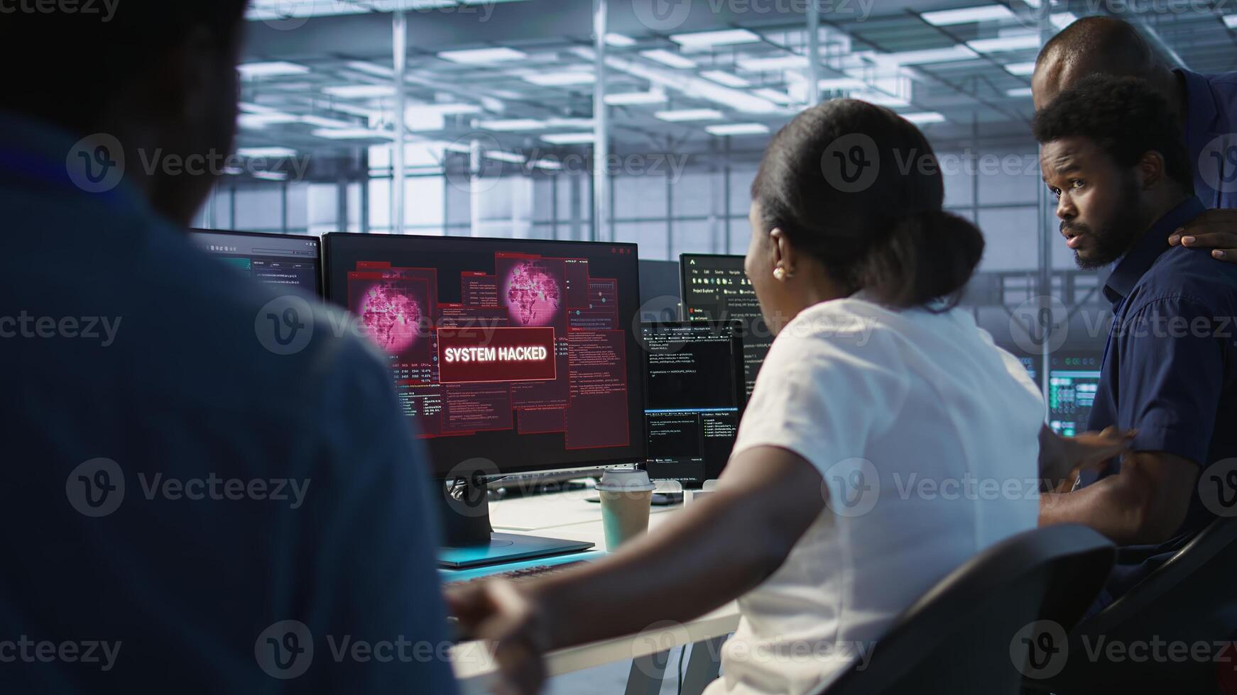Woman requesting help from cybersecurity team after seeing security incidents affecting data center network system, protecting infrastructure from hacker attacks, camera A Pro Photo