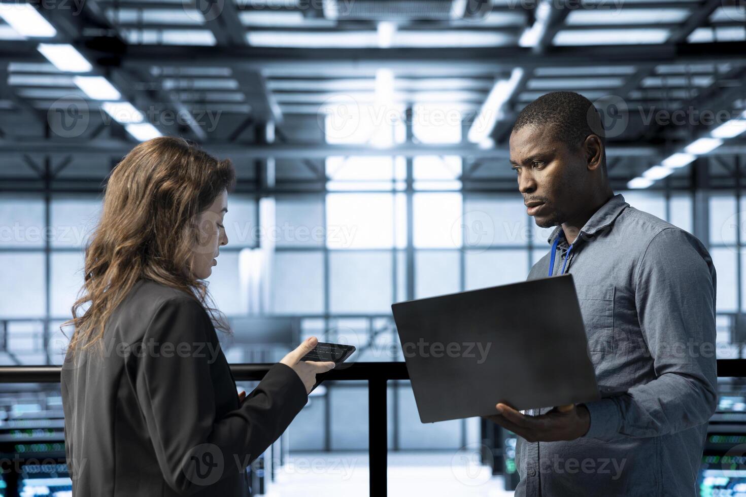 Computer scientists in data center using laptop and tablet, executing security patches, verifying firewall configurations. Man and woman performing equipment vulnerability scans in server farm Pro Photo