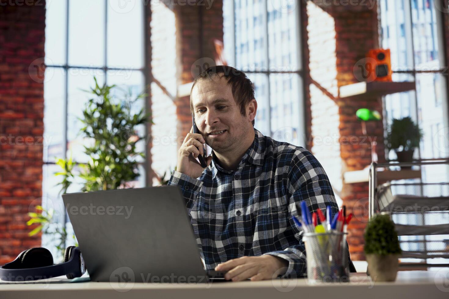 Happy employee at desk using laptop excited to receive phone call from friend. Cheerful man in home office using cellphone, discussing with coworker in telephone call while using notebook device Pro Photo