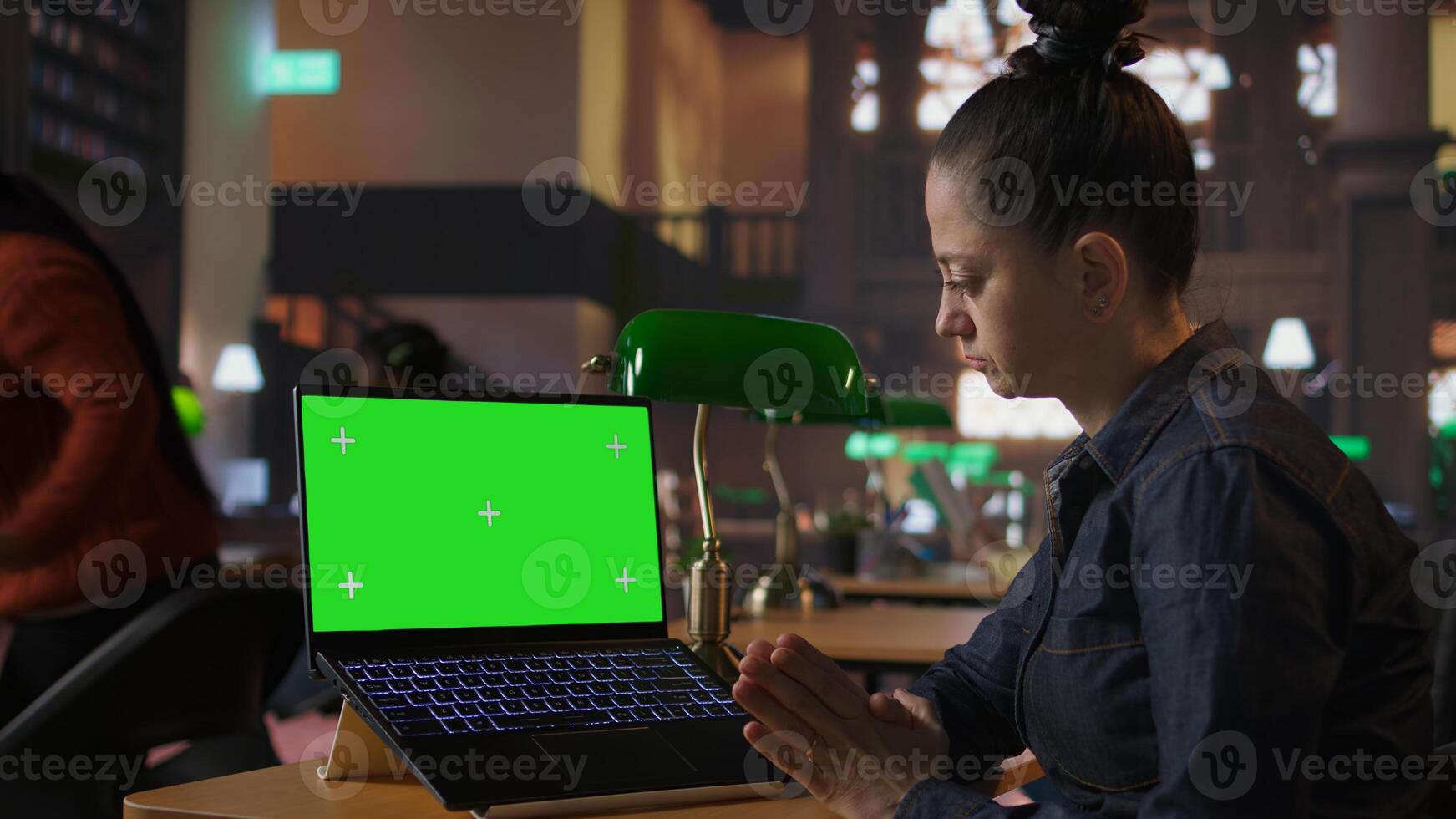 Professional librarian working on her laptop next to mockup screen in a public library, providing academic resources and guidance. Evaluating educational information within the database. Camera A. Pro Photo