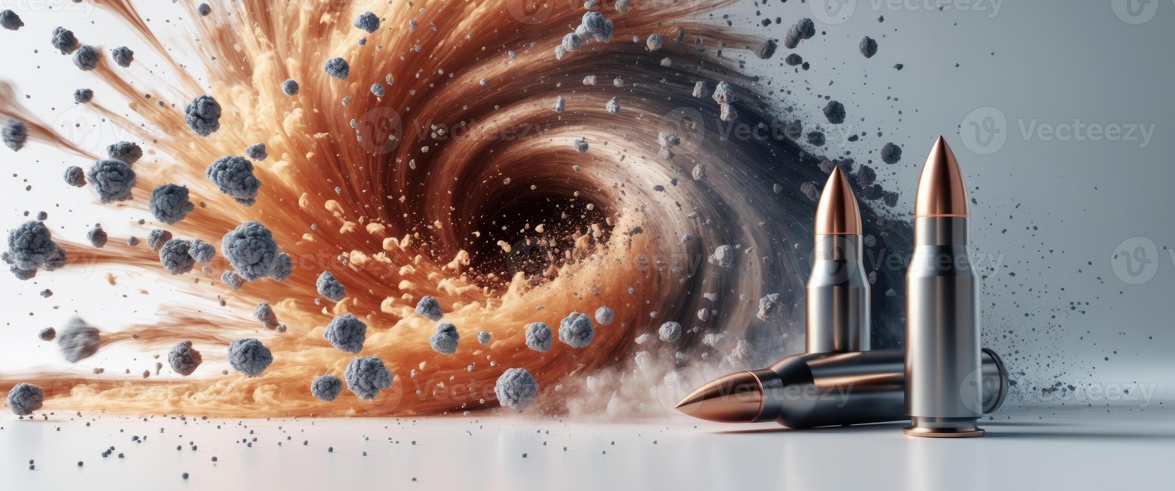 Dynamic bullets in motion surrounded by explosive particles creating a dramatic background with ample blank space for creative text insertion. Pro Photo
