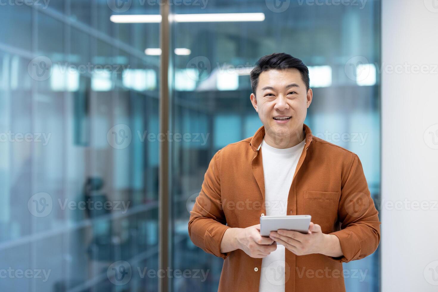 Portrait of successful Asian man inside office. Businessman smiling and looking at camera while holding tablet computer. Programmer developer at workplace near window. Pro Photo