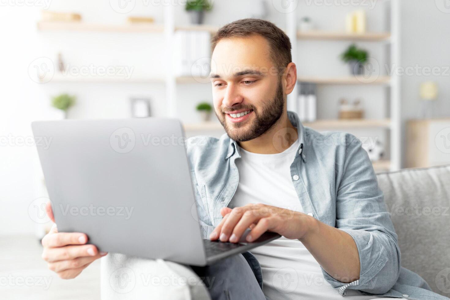 Cheerful millennial man sitting on couch with laptop computer, working or studying online from home office. Joyful Caucasian guy participating in web lecture, taking part in conference Pro Photo