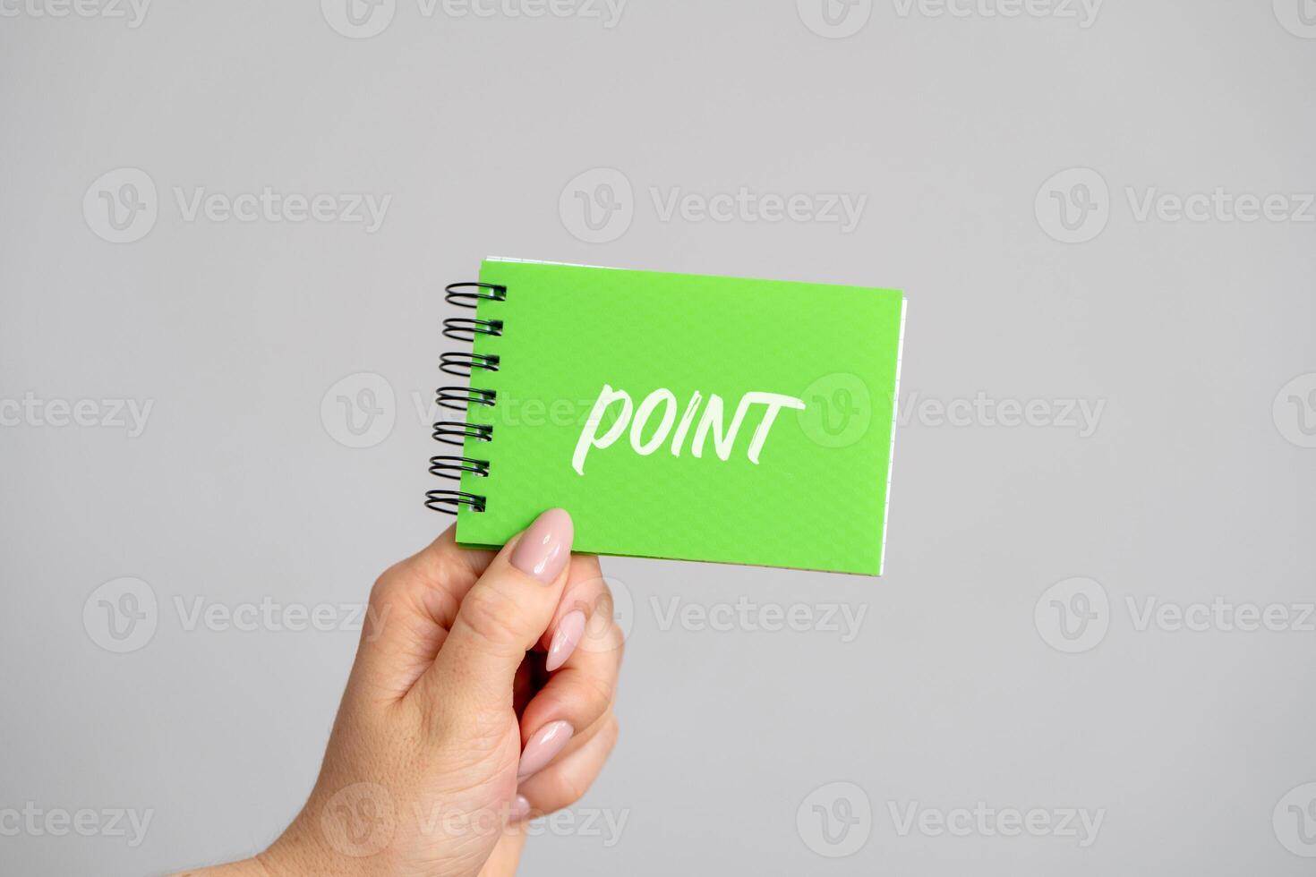 Notebook with the word Point in female hands. Point or destination. Gist business concept Pro Photo