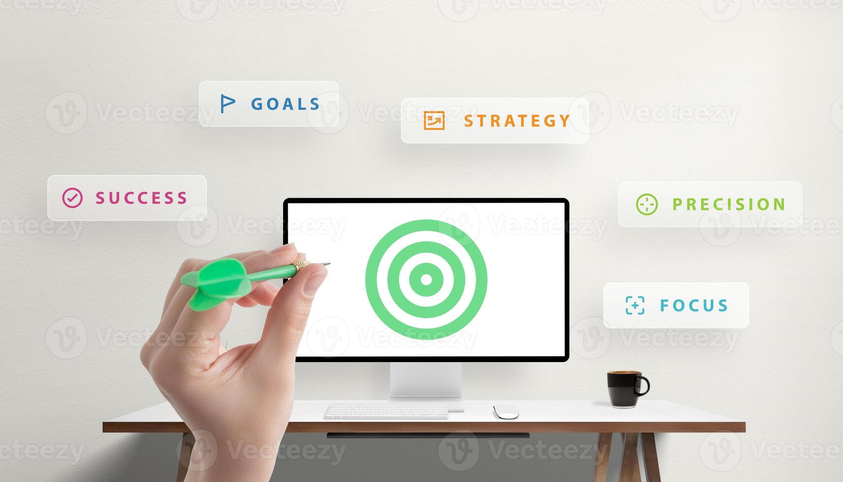 Hand holding a dart aiming at a target displayed on a desktop monitor, surrounded by words like goals, strategy, and success, symbolizing the integration of technology, marketing, and precision Pro Photo