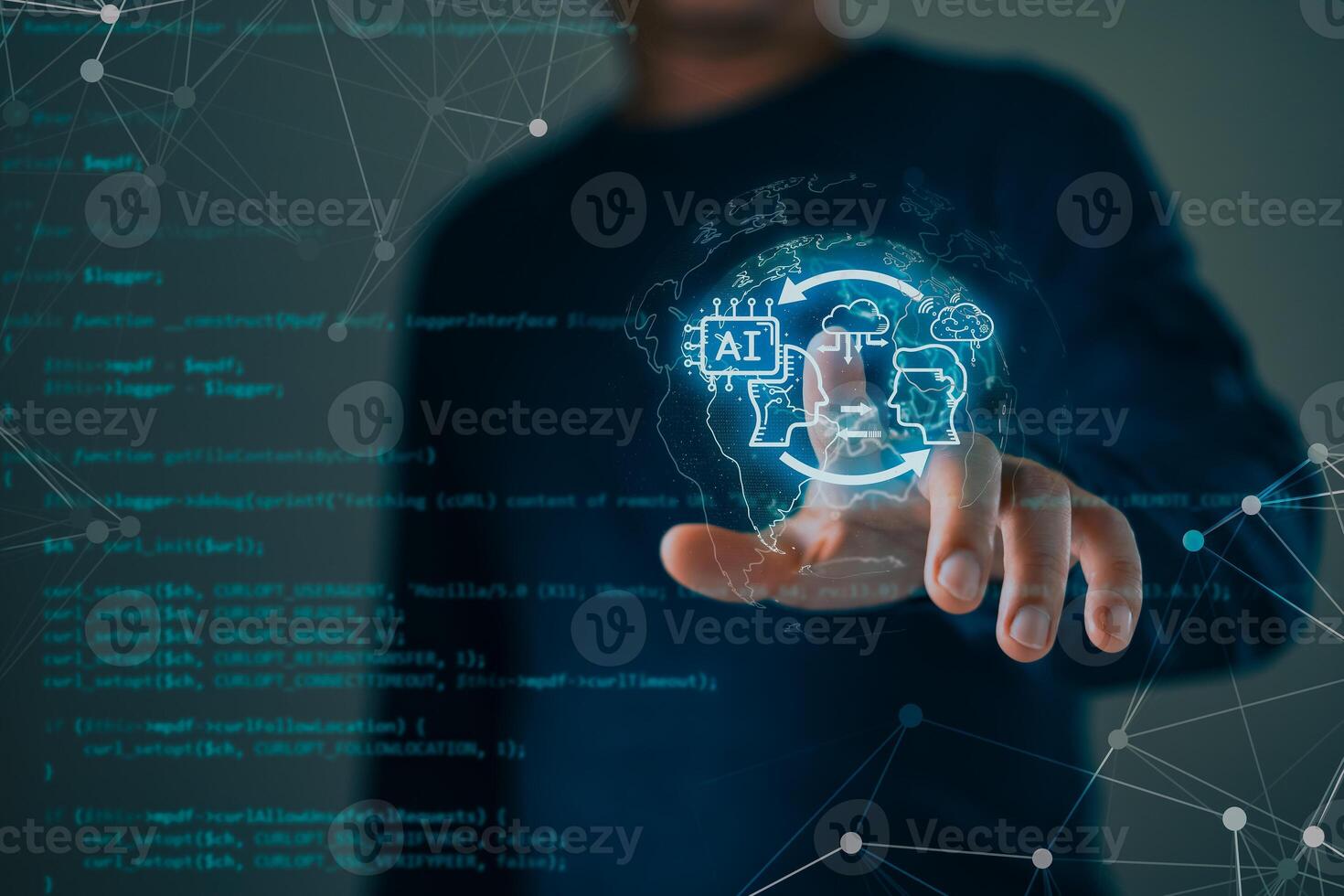 man touch ai auto chat bot. Big data center storage.Digital Artificial Intelligence technology disruption concept. We are implementing storage technology support and service in the business. Pro Photo