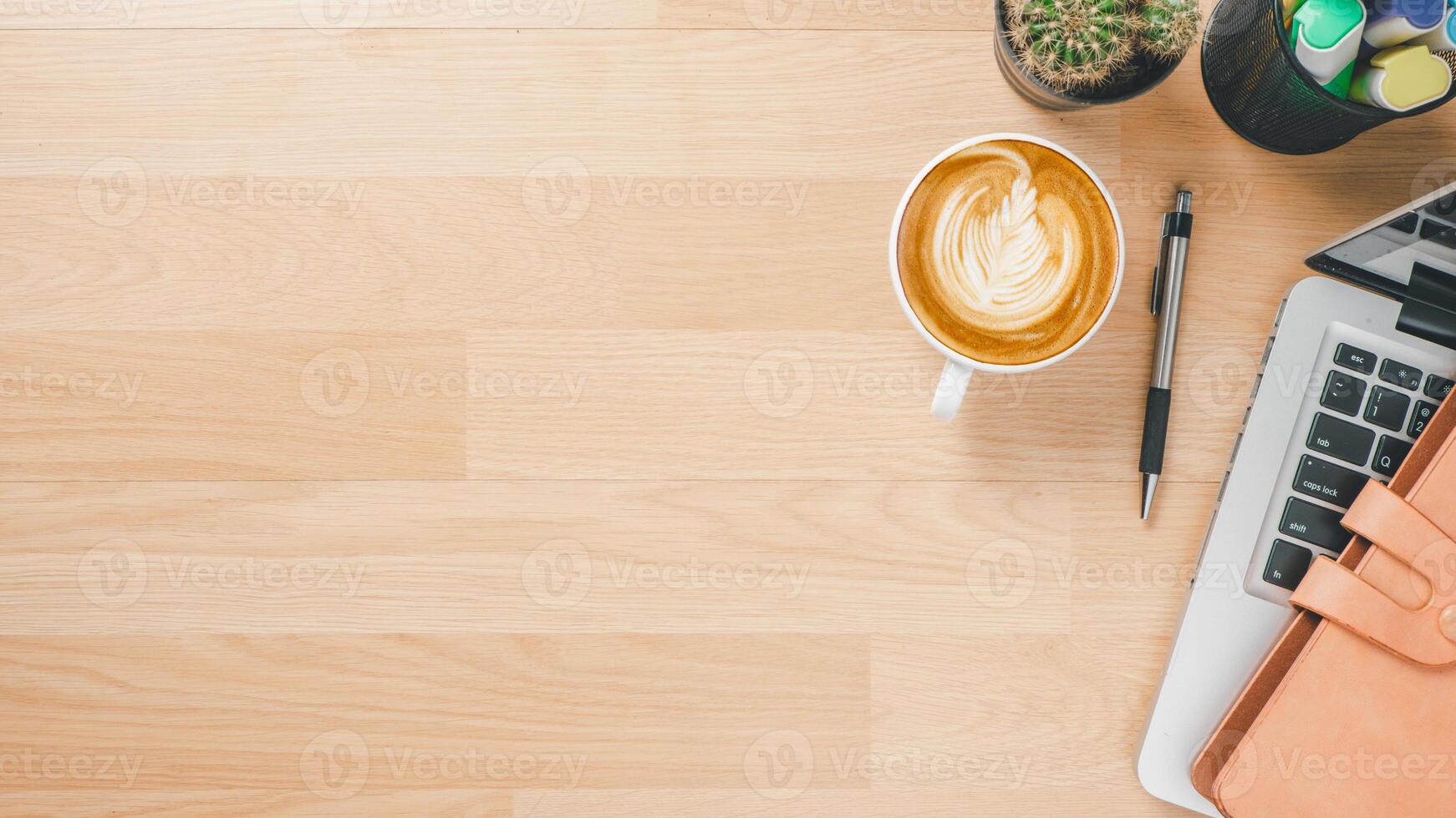 Office desk workspace with laptop computer, notebook, pen and cup of coffee, Top view flat lay with copy space. Pro Photo