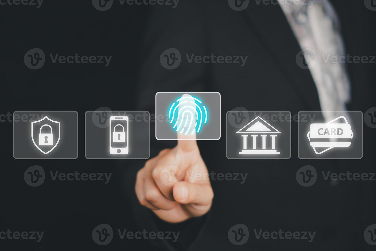 Business woman hand using fingerprint indentification to access personal financial data, Fingerprint scan provides security access with biometrics identification. Pro Photo