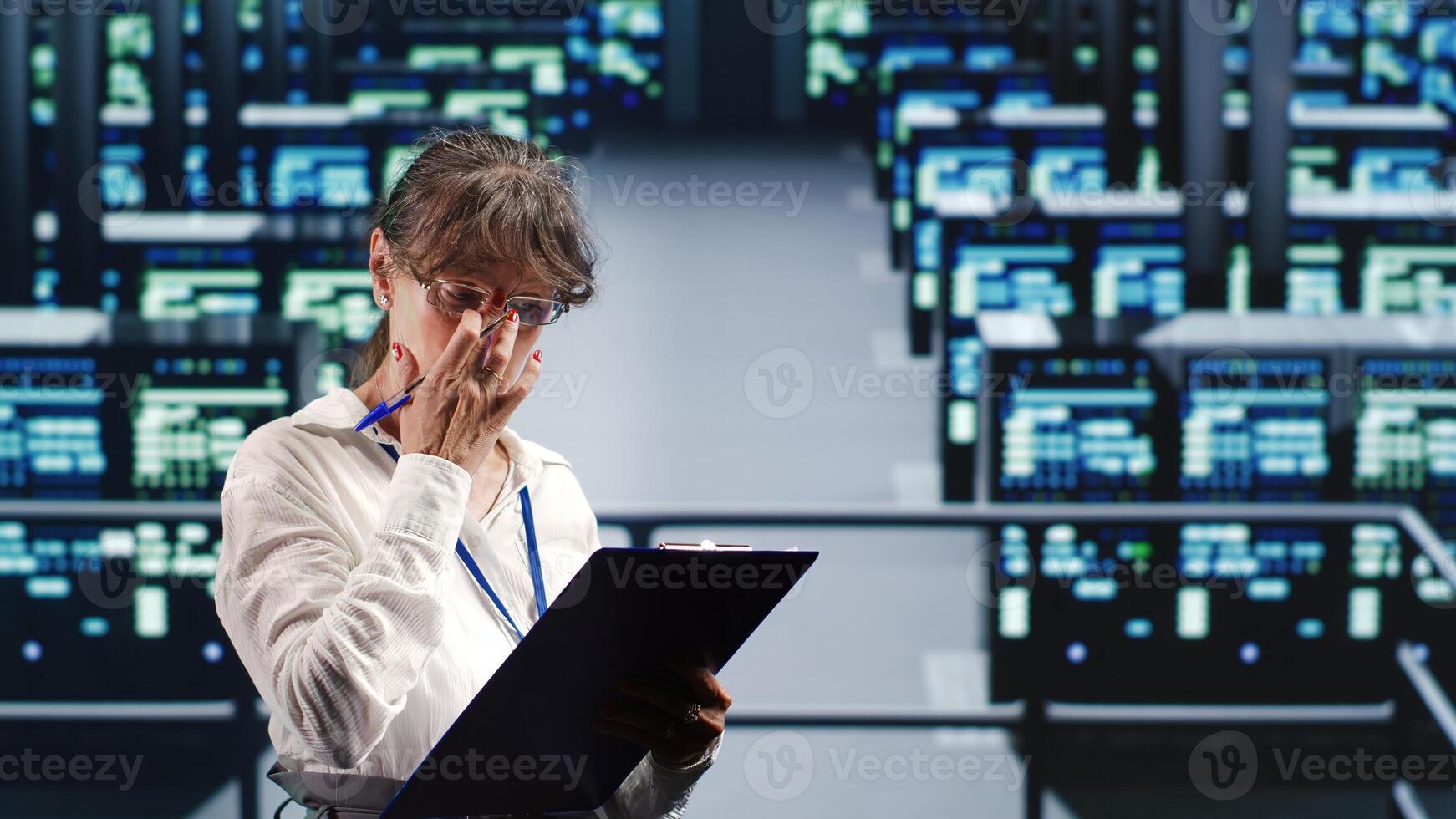 Knowledgeable serviceman in data center equipped to handle complex computational operations, doing regular upgrades to server units, increasing processing power to prevent hazards Pro Photo
