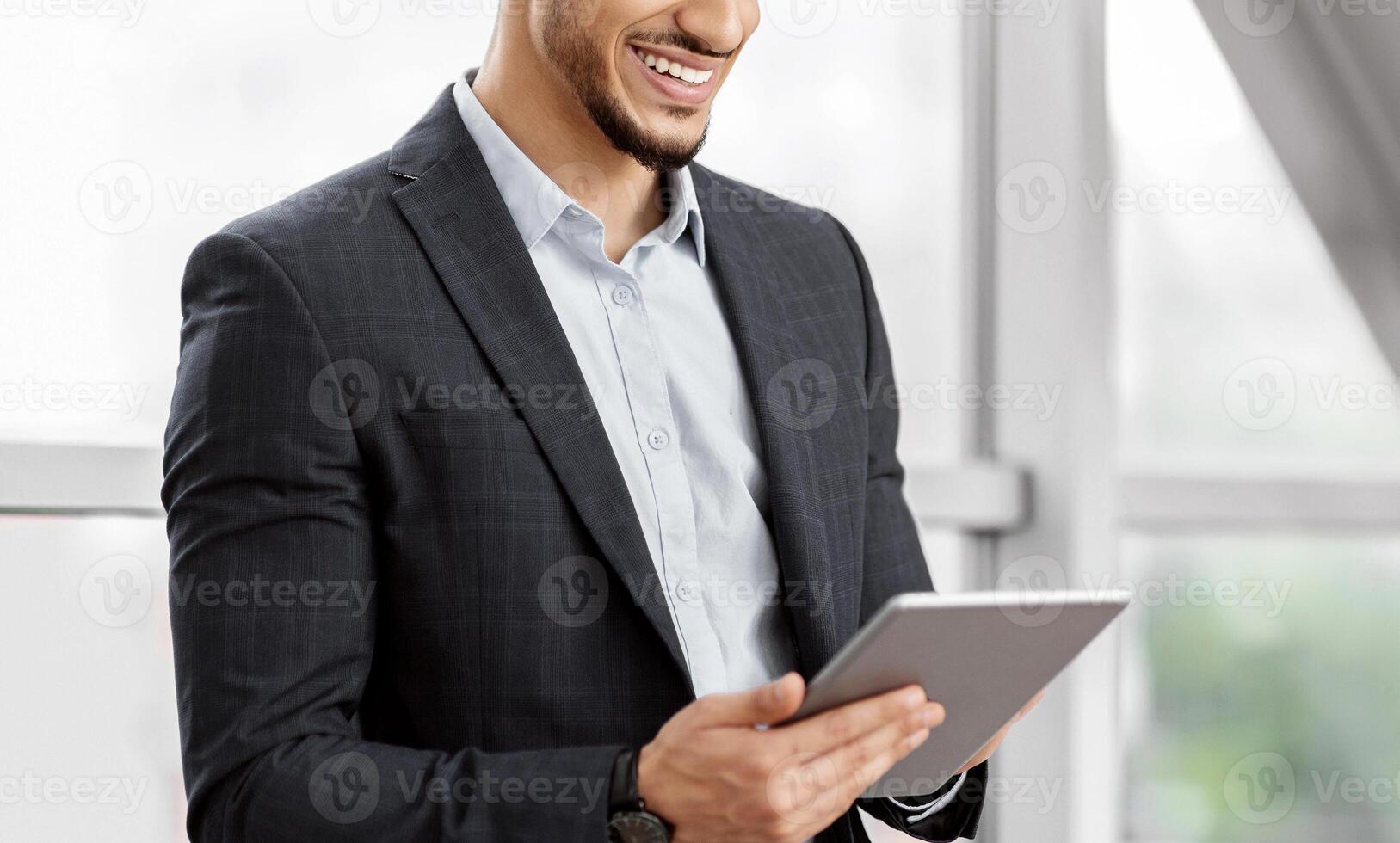 Handsome Young Arab Businessman Using Digital Tablet While Waiting At Airport Terminal, Smiling Middle Eastern Man Working Online Or Browsing Internet On Tab Computer, Enjoying Modern Technologies Pro Photo