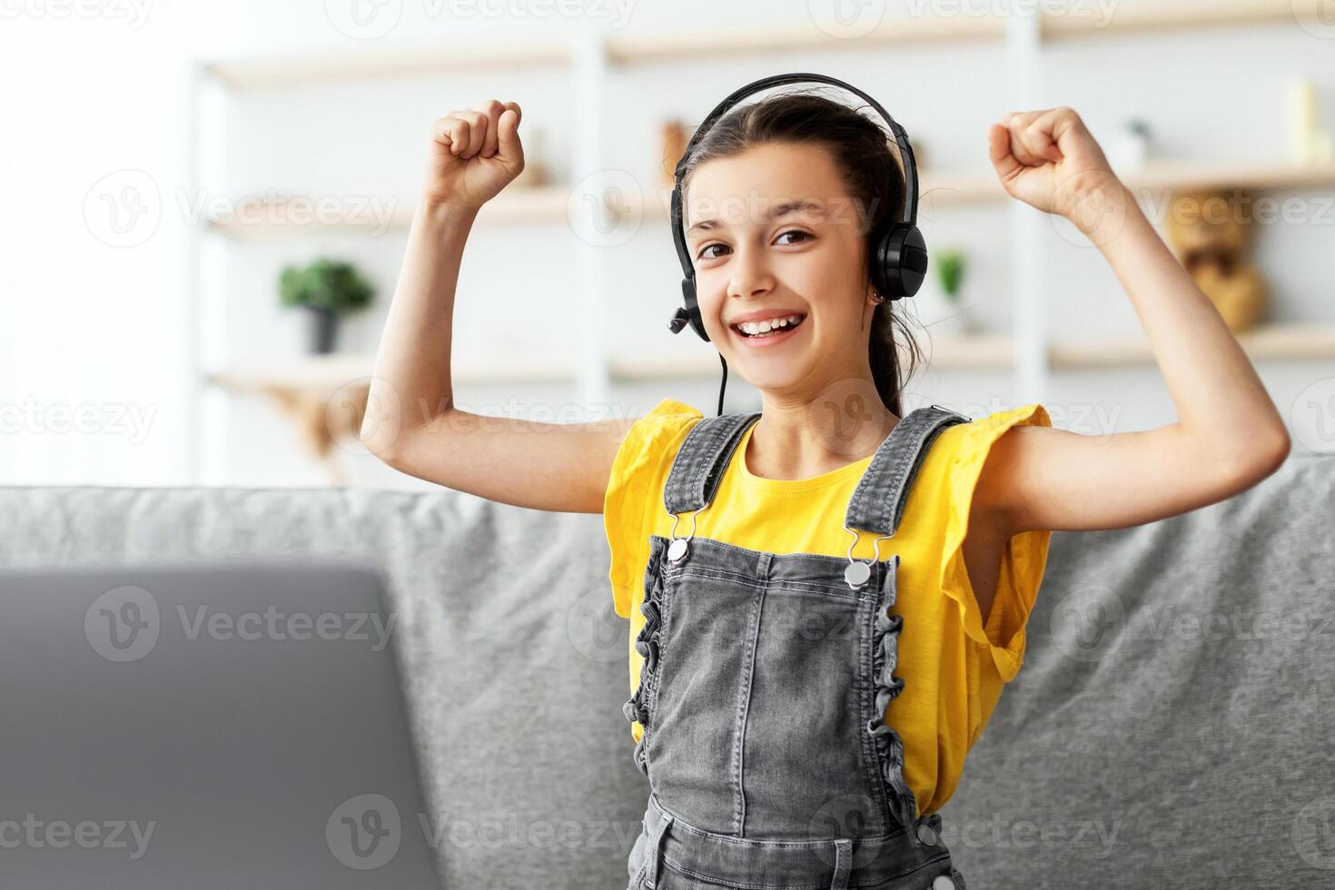 Portrait of smiling child wearing headset showing yes gesture playing online game or studying, shaking and raising clenched fists up in the air, looking at camera, using computer free copy space Pro Photo