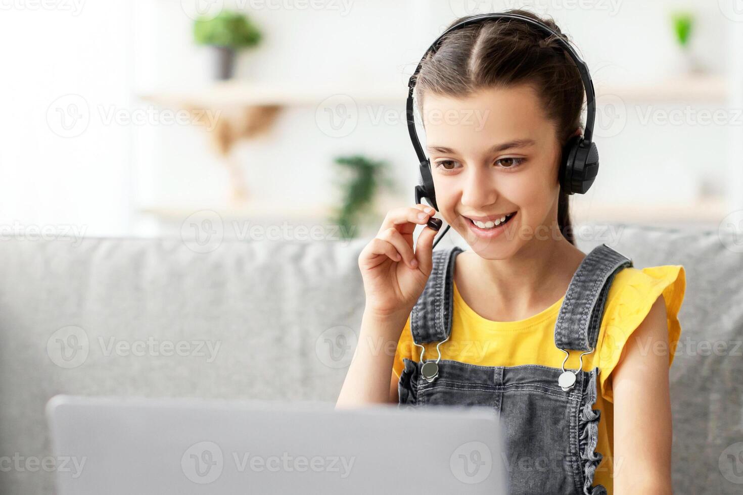 Kids And Technology Concept. Portrait of smiling girl sitting on couch at table and using laptop computer, wearing and touching headset talking in microphone having call or playing online game Pro Photo