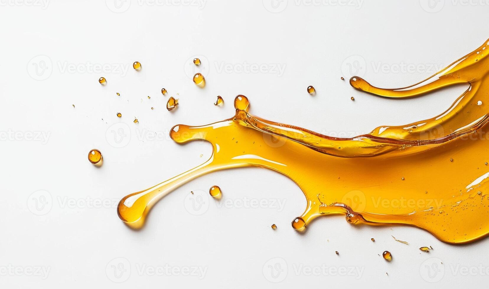 Golden honey splashes across a clean surface, creating intricate patterns and droplets. Pro Photo