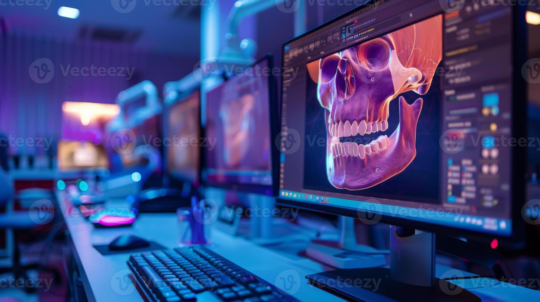 Modern healthcare facility showcases advanced imaging technology with a computer displaying a detailed skull scan. The environment is illuminated with ambient light, creating a high tech atmosphere. Pro Photo