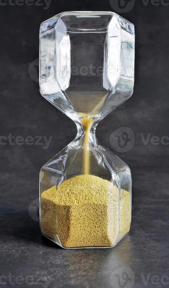 Close up Hourglass with golden Sand in dark background, Every second count, running out of time or time up or passage of time concept Pro Photo