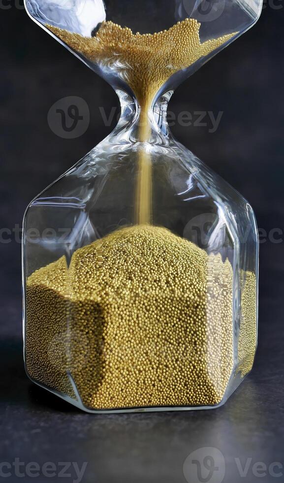 Close up transparent Hourglass Falling golden Sand in dark background, Every second count, running out of time or time up or passage of time concept Pro Photo