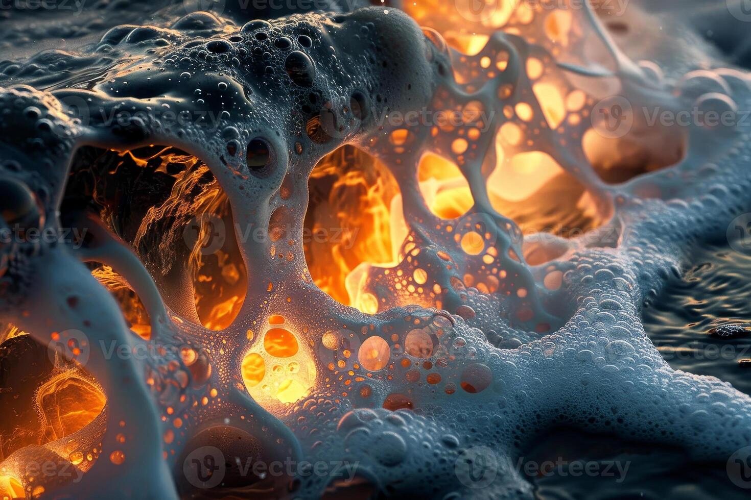 Molten lava flows meet the ocean, sending up clouds of steam and bubbles exploding with light as the sun sets, creating a vibrant and dramatic visual experience Pro Photo