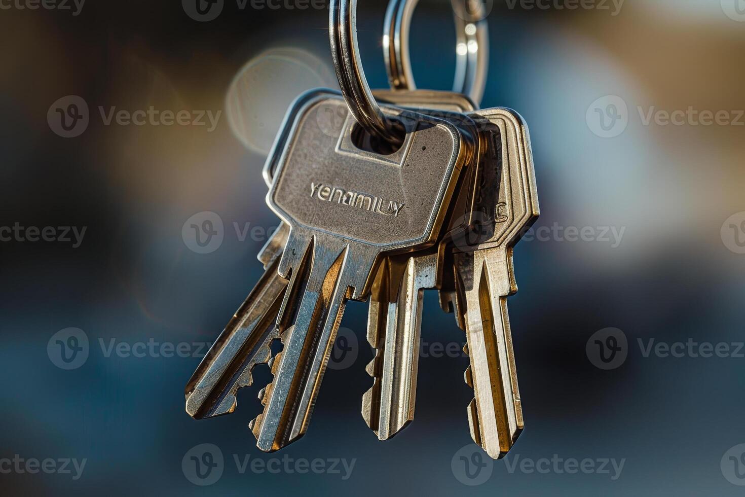 A collection of shiny metal keys is visible on a keyring, glinting in natural light while set against a softly blurred backdrop, creating a sense of depth Pro Photo