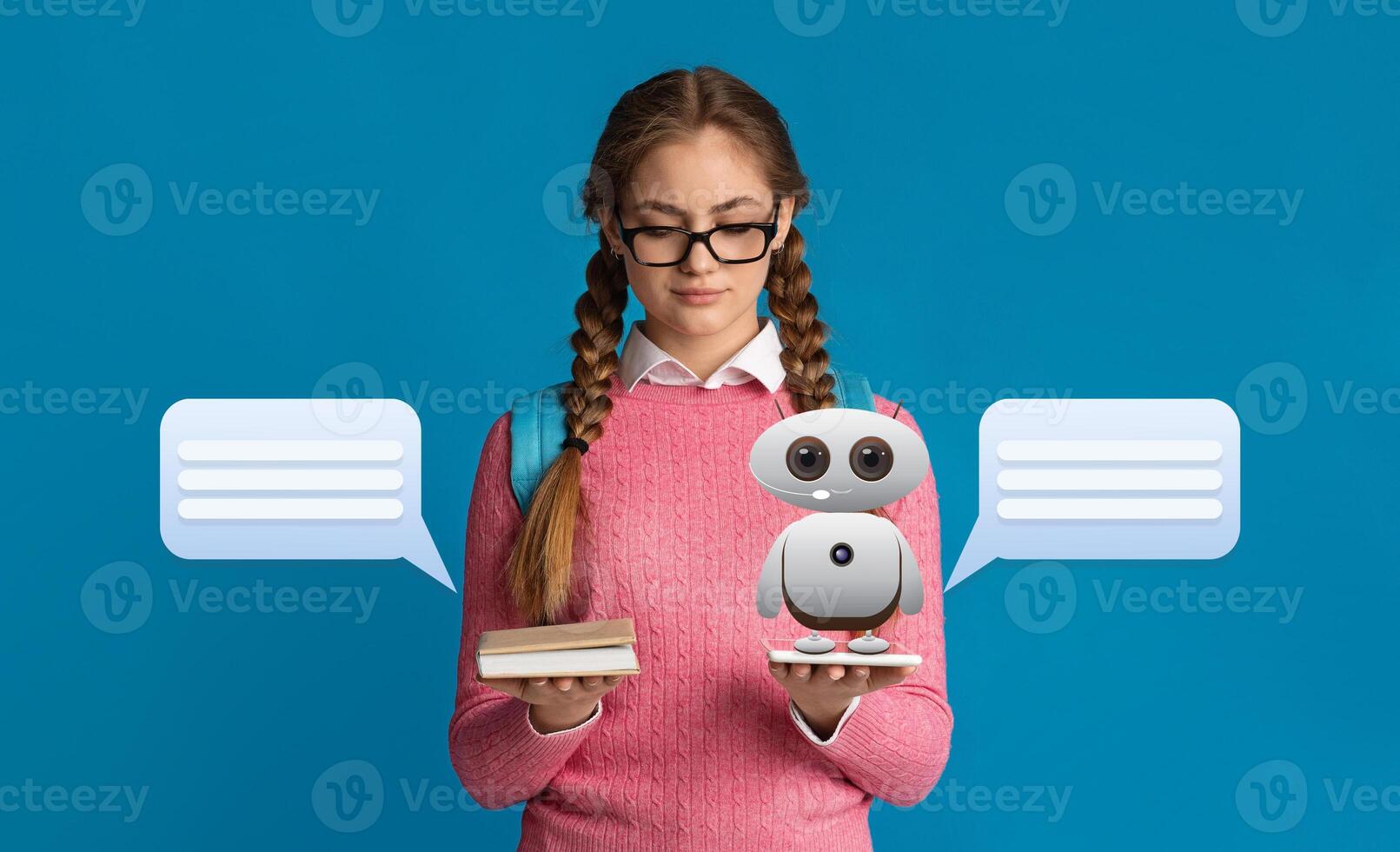 A young student in glasses holds books and a robotic assistant in front of a bright blue background, illustrating the impact of artificial intelligence on educational practices. Pro Photo