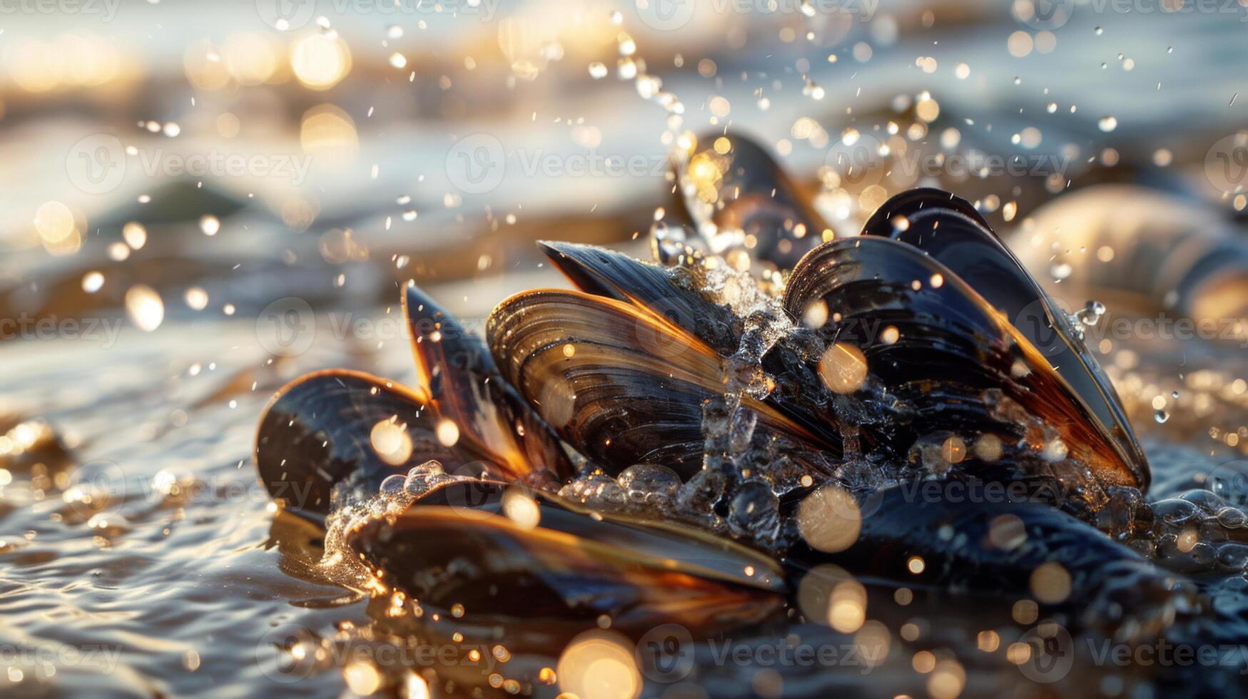 Waves gently roll over a cluster of open shells at the beach, creating sparkling droplets that catch the warm light of sunset, enhancing the natural beauty of the seaside. Pro Photo