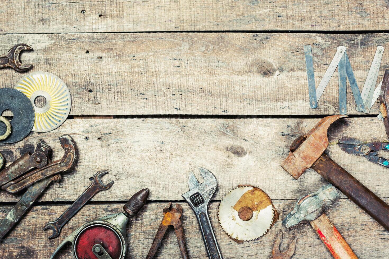 Various hand tools arranged on a rustic wooden workbench in a workshop setting showing craftsmanship and maintenance activities Pro Photo