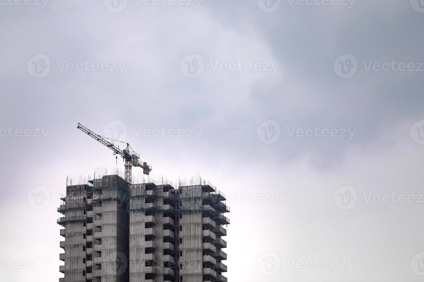 Heavy load crane on top of a building against the cloudy sky, with copy space. Pro Photo